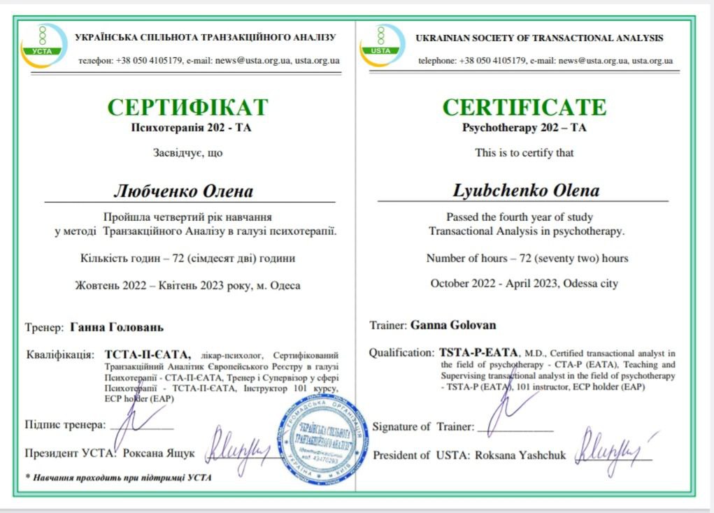 Я — психолог, сексолог, психотерапевт із понад 10-ма роками практики. Працюю у модальності транзакційного аналізу. Моє завдання — допомогти вам знайти відповіді, відчути внутрішній баланс і рухатися до свого щасливого «я».
